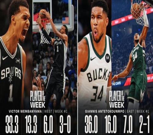 此外,NBA官方公布了第一期周最佳球员,分别是西部马刺队的维克托-文班亚马和东部雄鹿队的扬尼斯-阿德托昆博。其中,文班亚马场均得到33.3分13.3篮板6封盖,率领马刺取得3胜0负,阿德托昆博场均36分16篮板7助攻,率领雄鹿2胜1负。这个周最佳颁发得一点毛病都没有,文班亚马这是他第二次荣获周最佳球员,本赛季,肉眼可见的文班亚马超级进化,主要体现在进攻手段,以及对抗能力上,休赛期增肌的效果立竿见影,以文班亚马的身高,加上后卫般的进攻技巧和协调性,你可以在场上看见他做出各种匪夷所思的得分终结,根本没在其他球员身上见过。