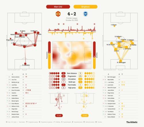 虽然这场比赛曼联并不像在安菲尔德那样频繁采用长传推进——拉门斯本场只开出了34脚长传,而非此前的45脚——但球队依然延续了本赛季标志性的快节奏、直接的风格。这支从上赛季还在为后场组织发愁的球队,如今已能迅速而高效地将球推进到对方半场。