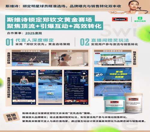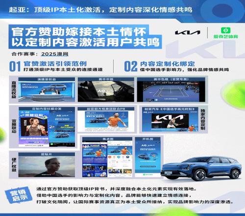 - 聚焦顶尖赛事,嫁接本土情怀:澳网期间,斯维诗定制《郑钦文赛事五佳球》,起亚打造《中国选手高光时刻》,借中国球员快速链接消费者,深化品牌渗透。