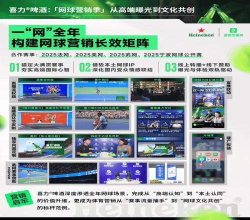 - 赞助本土赛事,拓展场景边界:联动转播与线下赞助,构建“曝光-认知-体验” 模式。如喜力通过爱奇艺体育合作武网,签约官方赞助商,实现价值跃迁。