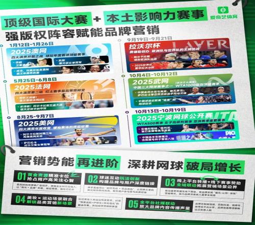 爱奇艺体育长期深耕网球领域,手握澳网、法网、美网三大满贯,及武网、宁网等本土赛事版权,构建“覆盖有广度、内容有深度、版权有头部”的内容矩阵。其打通线上营销与线下场景创新链路,为品牌提供灵活解决方案,实现赛事IP热度与品牌商业价值的深度融合。