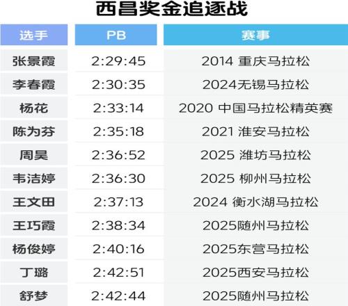 没有外籍,跑到2:28:00以外的女子冠军将获得5万美元的奖励,即使第十名也有800美元入账。如此诱人的条件让一众职业精英往这里扎堆。再加上北马和杭马召唤到最顶尖级的职业选手,今年的西昌将迎来位于“腰部”的大众女精英选手奋力一搏的最好机会。