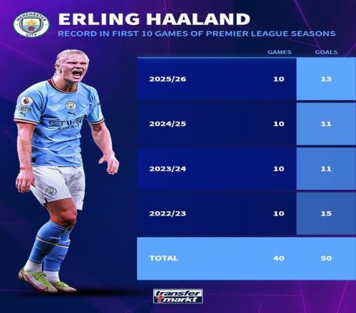 哈兰德曼城生涯英超赛季前10轮进球统计