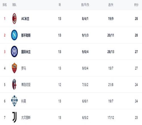 在积分榜上,AC米兰的战绩是8胜4平1负,拿到28分,排名榜首。那不勒斯也是28分,但是,净胜球少1个,只能屈居第2。第3的是国际米兰,9胜4负的战绩,拿到27分。而罗马的战绩和国际米兰一模一样,也是27分,排名第4。冠军的争夺非常激烈,前2积分相同,前4差距最多1分。博洛尼亚和科莫都是24分,排名第5和第6。第7的是尤文图斯,拿到23分。拉齐奥只拿到18分,排名第8。亚特兰大虽然赢球,但是,总积分只有16分,排名第11。