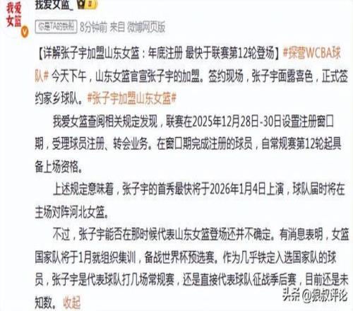 若是常规赛第12轮起具备上场资格为标准,张子宇的首秀最快将于2026年1月4日上演,球队届时将在主场对阵河北女篮。