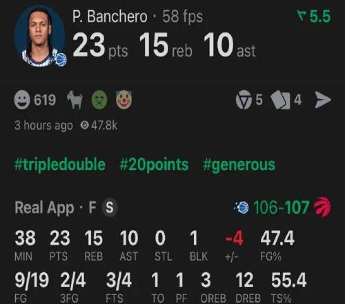 班凯罗又一次打出三双,全场贡献23分15篮板10助攻。