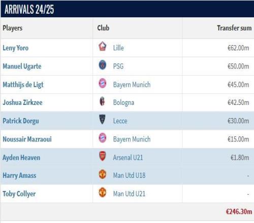 北京时间1月5日,曼联官方宣布主教练阿莫林下课。阿莫林时期,曼联一共通过转会签入七名球员,共花费了2.825亿欧元。