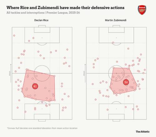 在无球状态下,苏比门迪在阿森纳队内中场三区的场均抢断次数(0.94次)排名第一,而赖斯排名第六(0.63次)。尽管造成这一情况的部分原因是后者的防守动作覆盖区域更大,如下方图表所示。