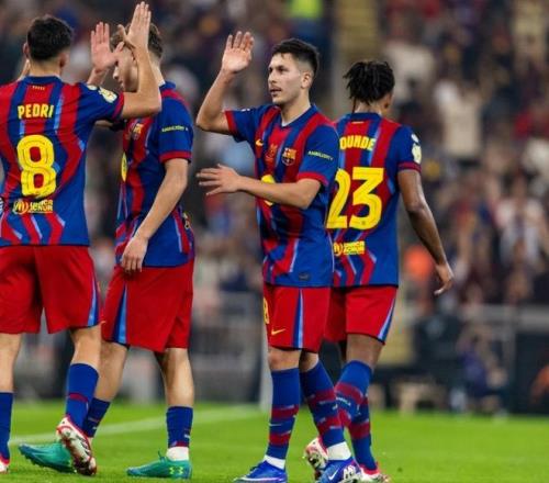 相比较之下,巴萨就赢得简单许多了;与毕尔巴鄂竞技的西班牙超级杯当中,上半场比赛费兰-托雷斯率先破门拉开进球序幕;第30分钟拉菲尼亚左路传中助攻费尔明扩大领先优势;第30分钟乌奈-西蒙扑救失误送礼,巴尔德吉小角度破门;紧接着拉菲尼亚在第38分钟小角度再度爆射破门。光是上半场比赛巴萨便轰进了4球早早将比赛悬念终结;下半场第52分钟拉菲尼亚再进一球,巴萨5球大胜轻轻松松拿到了西班牙超级杯决赛的门票。