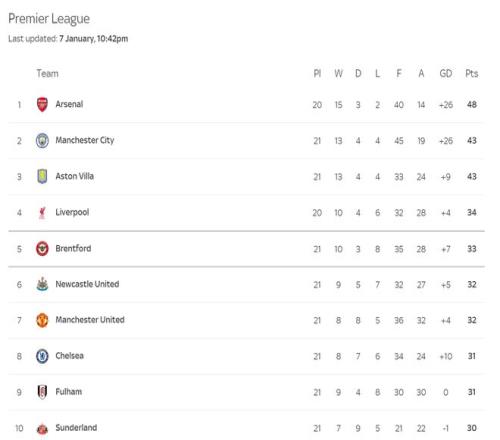 积分榜上,曼联确实把握住切尔西输球的机会超越了对手,可惜布伦特福德后来居上,占据了积分榜第五的位置,他们本轮3-0大胜桑德兰。纽卡斯尔联也依靠净胜球反超红魔,现在弗莱彻的球队落到了第7名。