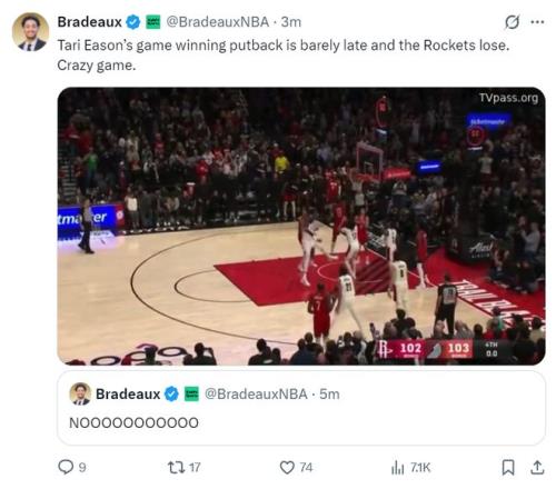 火箭记者晒出伊森补篮绝杀超时,写道:NO!!!伊森的补篮绝杀超时了,他为了球队的胜利付出一切,这场比赛太疯狂了。